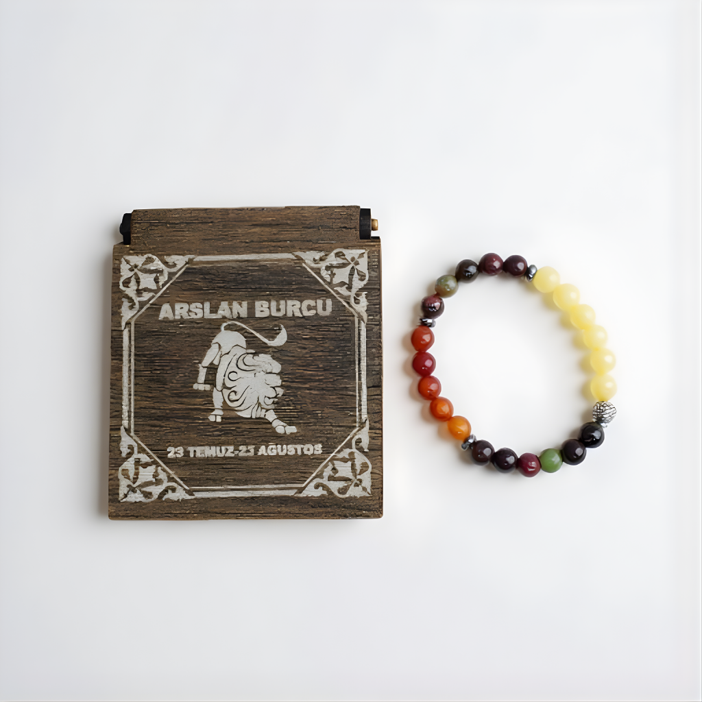 Aslan Burcu Doğal Taş Bileklik, güçlü duruşu ve lider ruhu temsil eden Aslan burcuna özel olarak tasarlanmıştır. Cesaret, özgüven ve enerjiyi simgeleyen doğal taşlarla hazırlanan bileklik, şık ve dikkat çekici bir stile sahiptir. Günlük kullanıma uygundur. Özel ahşap hediye kutusu ile sunularak sevdikleriniz için anlamlı ve prestijli bir hediye alternatifi oluşturur.