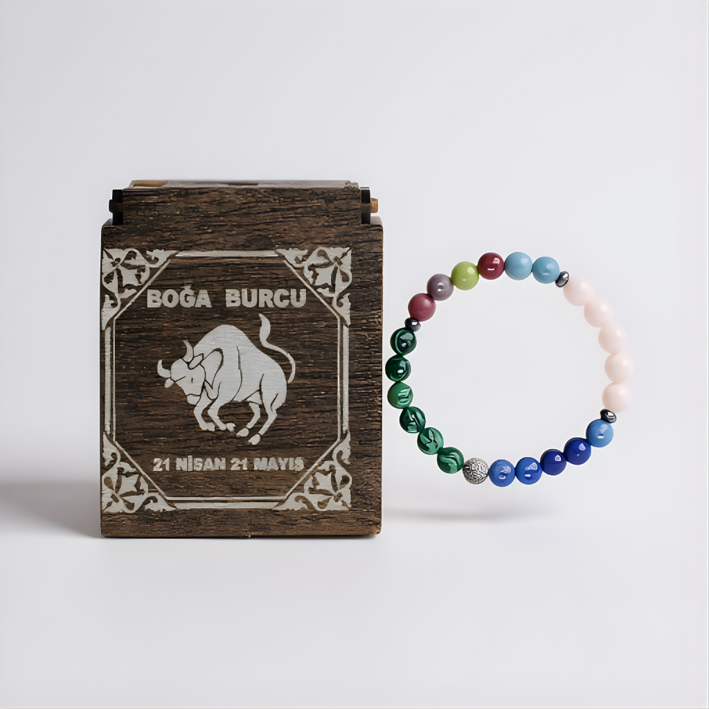 Boğa Burcu Doğal Taş Bileklik, doğanın enerjisini şıklıkla buluşturur. Boğa burcunun huzur, denge ve güç arayan yapısına uyumlu doğal taşlarla tasarlanan bileklik, zarif detaylarıyla öne çıkar. Özel ahşap hediye kutusu sayesinde anlamlı ve şık bir hediye seçeneğidir. Günlük kullanımda stilinizi tamamlarken pozitif enerji sunar.