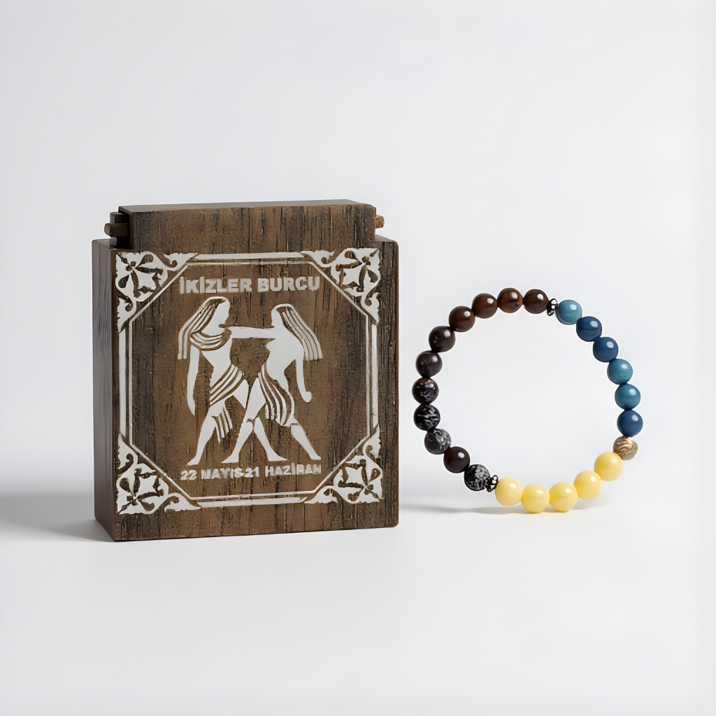 İkizler Burcu Doğal Taş Bileklik, enerjik ve özgür ruhlu İkizler burcunun karakterini yansıtır. İletişimi, zihinsel berraklığı ve uyumu simgeleyen doğal taşlarla hazırlanmıştır. Şık ve modern tasarımı günlük kullanıma uygundur. Özel ahşap hediye kutusu ile sunularak sevdiklerinize anlamlı ve zarif bir hediye alternatifi oluşturur.